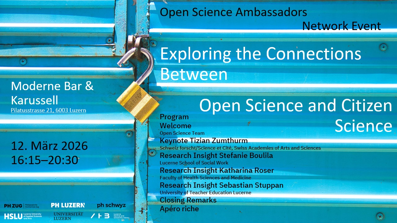 As announced, the first networking event of the Open Science Ambassador Programme of the Universities of Central Switzerland will take place on 12 March 2026, starting at 4:15 p.m. By establishing this Ambassador Programme, we aim to facilitate and strengthen low-threshold exchange and mutual peer-to-peer support among researchers.