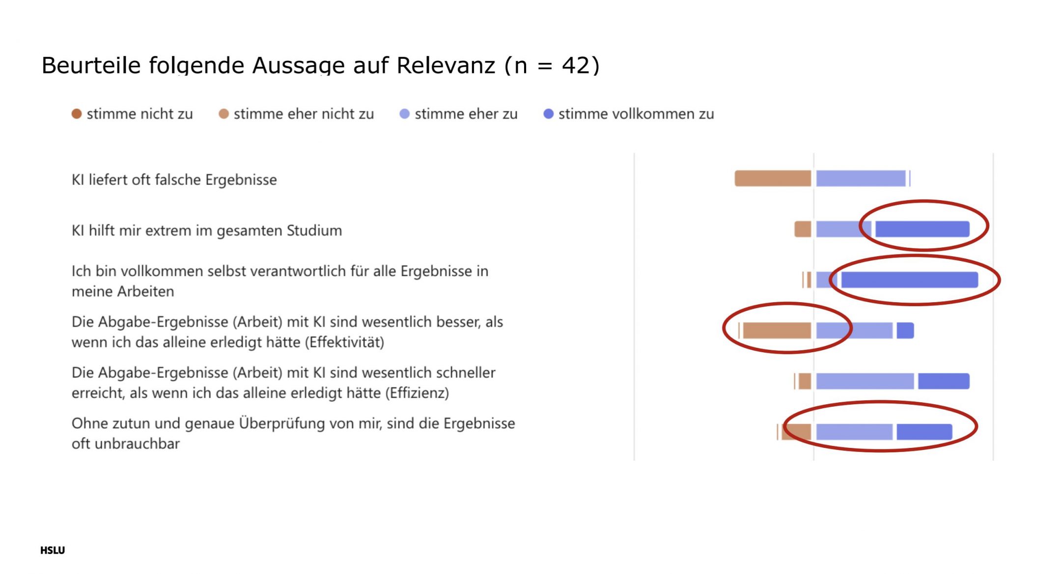 Die Umfrage zeigt, die Studierenden wissen, worum es beim Thema KI geht, dass kritisches Denken zählt und das Überprüfen von Ergebnissen, eigenständiges Recherchieren und Denken wichtige Kompetenzen bleiben. Sie sind sich bewusst, dass KI kein Ersatz für Fachkompetenzen ist. Sie stellen selbst auch die negativen Folgen der KI-Nutzung fest, und nennen beispielsweise Faulheit als eine mögliche Auswirkung.
