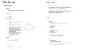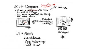 Wir mussten all unsere Ideen schliesslich auf die Core-Gameplay-Aspects reduzieren und in einer Konzeptskizze zusammenfassen. Das Ziel des Spiel ist Essen zu stehlen und möglichst viel auf Autos zu kacken.