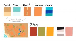Um den Mood des klar definierten Seaside-Town Settings zu unterstützen, haben wir verschiedene Artstyles, Schriften und Farbkonzepte anhand unserer Moodboards evaluiert. Besonders wichtig war dabei eine warme, von orangefarbenen Sunset- bzw. Golden-Hour-Stimmungen inspirierte Palette, welche die gemütliche und leicht verspielte Atmosphäre des Ortes verstärkt. Auch die Schrift wurde bewusst im Hinblick auf den humorvollen Ton des Spiels gewählt, damit sie den visuellen Ausdruck zusätzlich unterstützt. Auf dieser Grundlage entschieden wir uns schliesslich für einen doodle-artigen Stil, der diesen leichten, humorvollen Charakter am besten trägt. So entsteht ein stimmiges visuelles Gesamtbild, das die gewünschte Stimmung von Anfang an vermittelt.