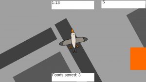 Für den ersten richtigen Prototypen mit funktionierendem Code haben wir etwas viel Zeit gebraucht. Das meiste haben wir mit einfarbigen Rechtecken und Quadraten gemacht, wichtigeres wie die Möwe hatten schon einen etwas einfacheren Sprite. Hier konnte sie schon fliegen indem sie sich in Richtung Cursor drehte und dann vorwärts bewegte. Unsichtbare Spawners haben zufällig Essen auf der Map gespawnt, das die Möwe dann aufsammeln und zum Inventar hinzufügen konnte, es sei denn es ist schon wieder despawned. Der obige 5 Sekunden Timer hat bei 0:00 bei der Möwe einen Sploot ausgelöst und vom Inventar eins abgezogen. Falls kein Essen im Inventar mehr war ist die Möwe stattdessen gestorben. Wenn ein Sploot auf einem Auto gelandet ist gab es 5 Punkte für den Score. Autos haben sich ganz einfach hin und her bewegt. Über den Gebäuden war die Möwe etwas langsamer.