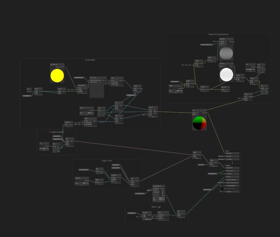 Also last but not least, this is my ShaderGraph setup for the GrassShader. It is a bit smaller than the WaterfallShader, but it still took a lot of time to get it to this point, especially the VertexShader.