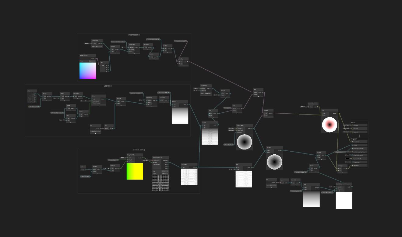 As seen in the ShaderGraph Setup, this is a mixture between the texture input, a fresnel node, a scanline, intersection calculation and some color multiplications.