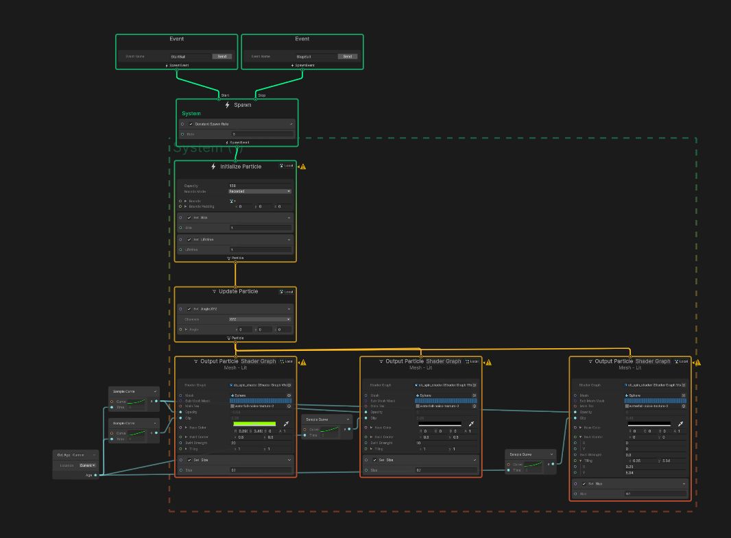 The Shader gets put into the VFXGraph Output and the variables are changed through an Event that is activated through a Script. The same Output is layered in the same way the FireplaceShader was, with different Color and Clip values.