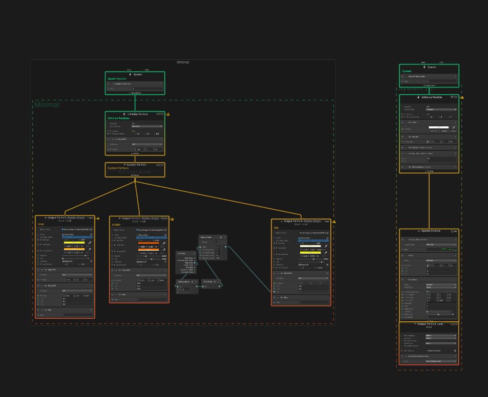 This is our VFXGraph-Setup, it creates a particle system that continiously spawns 1 particle over and over again. Because we can connect this to our ShaderGraph, the particle is animated and projected onto a mesh and thus creating a fire-like effect. To make it look better I instanced it 3 times with different values of speed and color.