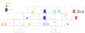 Um seinen wohlverdienten Schlaf zu erreichen, muss er verlorene Schlüssel finden, Türen öffnen und Kaffeekannen einsammeln, damit seine Müdigkeit nicht überhandnimmt. Wenn sein Energielevel zu tief sinkt, ist das Spiel vorbei. Sobald diese Grundidee feststand, kümmerten wir uns um die Basisarbeit. Dazu gehörten das Aufsetzen eines Unity-Projekts, das Erstellen eines Kanban-Boards zur Aufgabenverteilung und das Zeichnen weiterer Skizzen, um ein klareres Bild unserer Spielwelt zu erhalten.