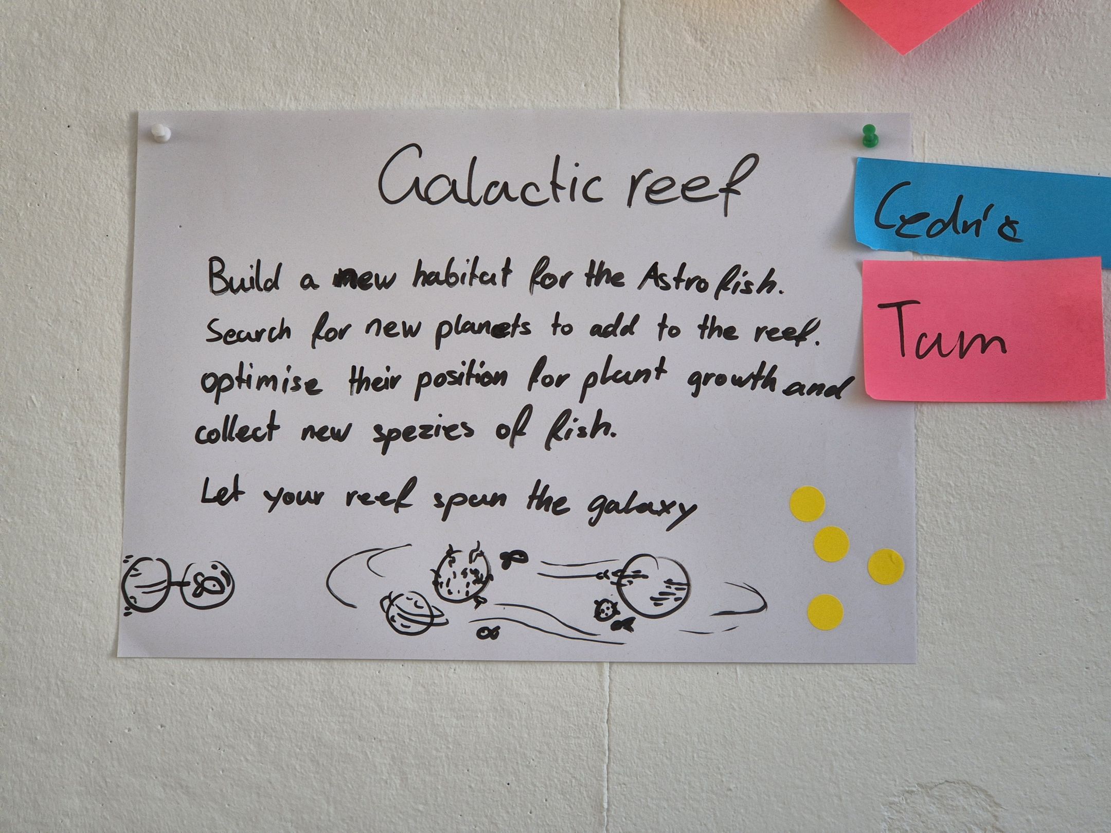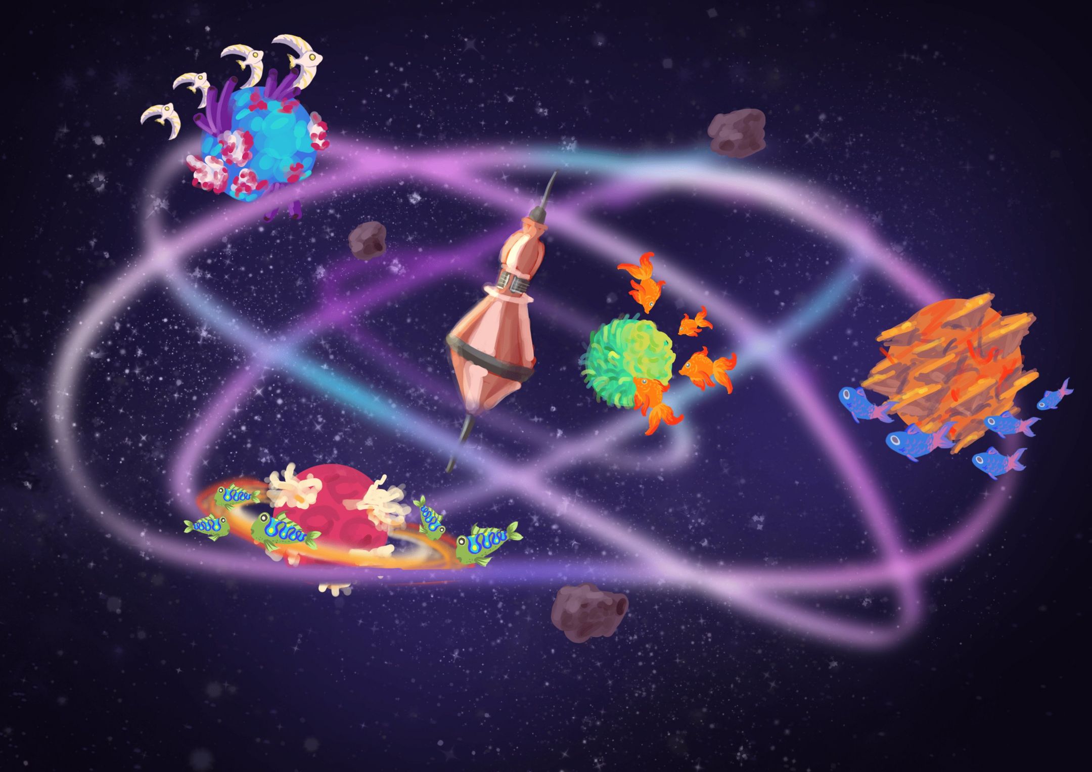 In our game you build your own planetary system that’s colonised by all kinds of Astrofish. You heard the fish from planet to planet and fertilize the corals on the way so that your fish have enough to eat. Later you can add more planets with all new kinds of fish.