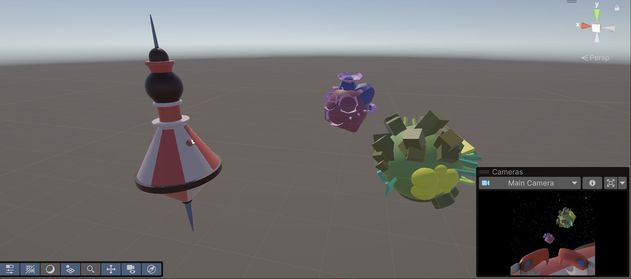 The planets are now full with mountains, hills, implied corals by a cylinder and a cave. We colored all these elements and now have a green themed and a blue themed planet. We also placed multiple fish on each planet and the player starts now from the space buoy.