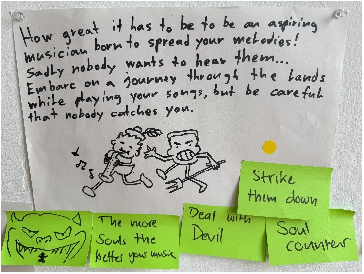 Zu Beginn unseres Prototyps einigten wir uns auf die Grundfunktionen, die wir im Spiel haben möchten. Der Spieler soll auf einer Map versuchen die Bewohner zu fangen, niederzuschlagen und ihnen seine Musik vorspielen, wodurch deren Seelen beim Teufel eingetauscht werden. Der Fokus lag dabei auf dem Camera Movement, dem Player und NPC -Movement, der Striking-Mechanik, einem Soul-counter und dem Trompetenspielen.