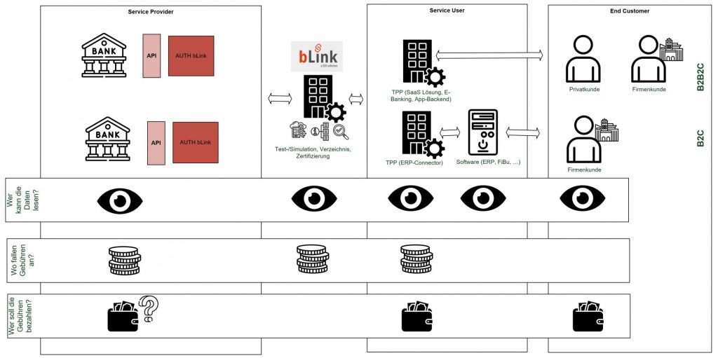Die heutige Lösung von bLink ist für B2B2C (Business to Business to Customer) ausgerichtet. Also typische Anwendungsfälle für Privatkunden und kleinere Unternehmungen, welche Ihre Bankdaten in einer App oder SaaS Lösung nutzen. Der grosse Teil von Firmenkunden nutzt aber Software, welche einen direkten Zugang benötigt (B2C). Dieser Use Case ist nicht abgedeckt bzw. führt nun dazu, dass Softwarehersteller wiederum Komponenten zwischenschalten müssen.