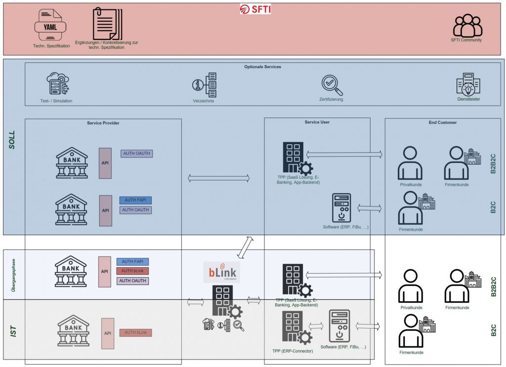 Die Lösung basiert auf der API‑Spezifikation des SFTI und wird zentral via bLink von SIX bereitgestellt. Ein Ausbau dieser Schnittstellen Richtung Open Finance ist seitens SFTI vorgesehen: