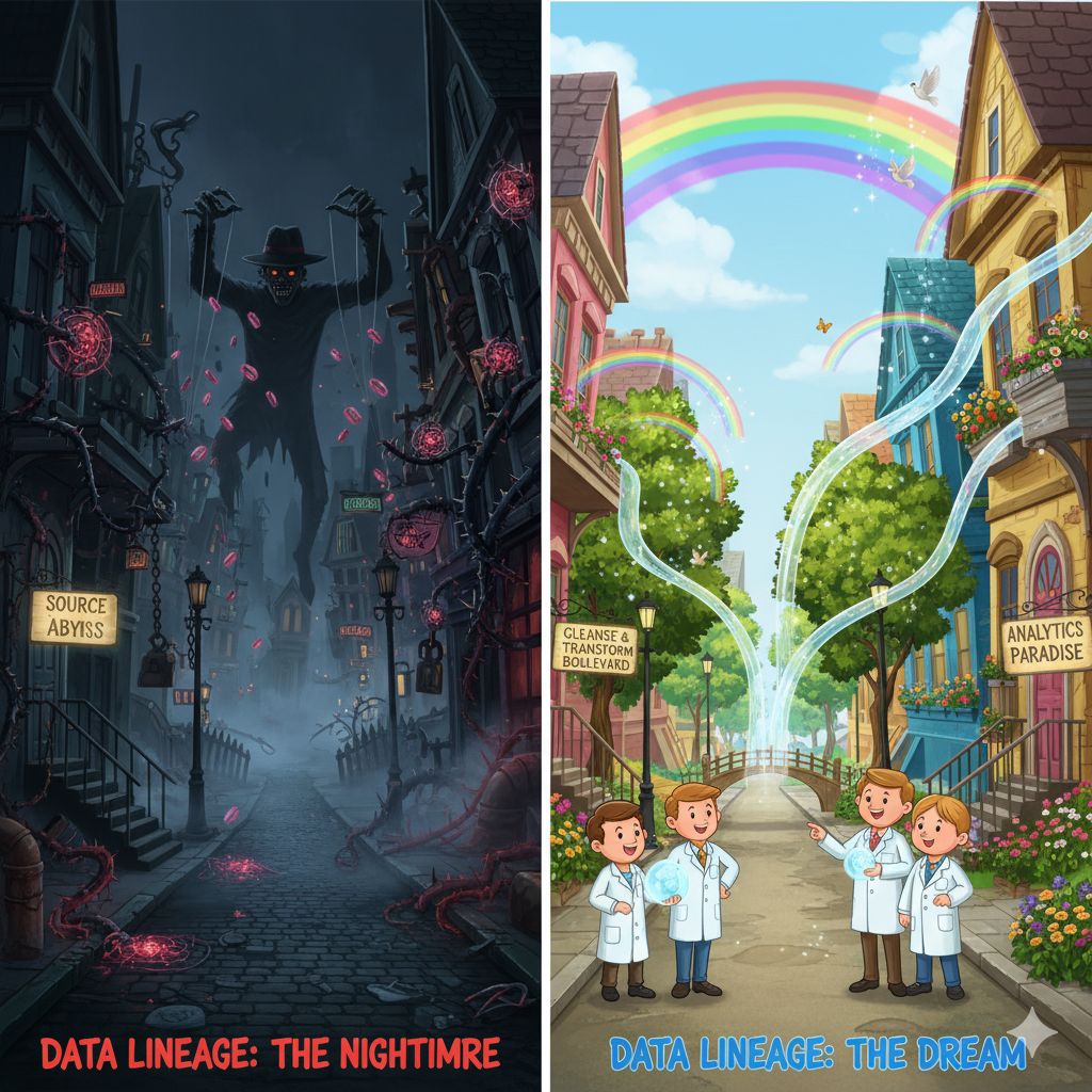 Data Lineage beschreibt die Rückverfolgbarkeit der Daten über deren gesamten Lebenszyklus. Also von deren Erstellung, über die Verarbeitungsschritte bis hin zur finalen Aufbereitung in einem Report. Darüber hinaus bis zu deren Löschung aufgrund regulatorischen Anforderungen o.ä. Wenn man mittels Data Lineage also weiss, welche Daten wo, wann und wie verarbeitet werden, kann man Doppelspurigkeiten, Fehlmanipulationen und diverse weitere Fehlerquellen schneller identifizieren und verhindern. So, dass die ETL-Street paradiesisch und übersichtlich daherkommt – und nicht, wie in einem Albtraum.