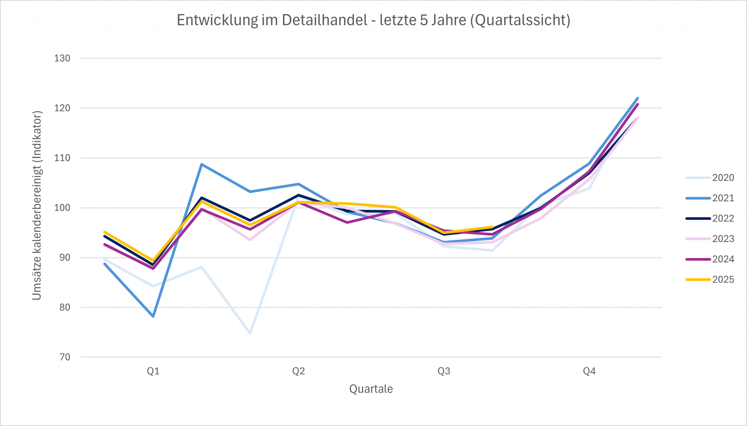 1) Gem. verschiedene Datensätzen des BFS (z.B. Detailumsatzstatistik) ist die Entwicklung des Detailhandels (3. Sektor, Abschnitt G) durchzogen mit einem leichten Aufwärtstrend. Die Auswertung nach Quartal zeigt den saisonalen Peak im Q4 (vgl. Bild). Dies könnte in Überlegungen zum Markteintrittszeitpunkt berücksichtigt werden. Gemäss der «Verteilung der Beschäftigten nach Wirtschaftsabschnitt/Grössenklasse» haben die Anzahl Beschäftigte zwischen 2011 (430K) und 2023 (416K) um 3.4% abgenommen. Der opendata -Datensatz «Monatliche Indikatoren für den Detailhandel ab 2010» enthält u.a. Umsatz-, Frequenz- und Geschäftslageindikatoren (als Netto-Saldo in %). In den letzten fünf Jahren haben Schwankungen in der Geschäftslage zugenommen.