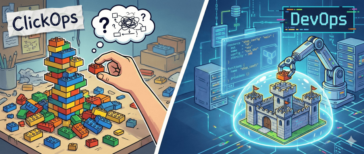In der IT-Welt ist das manuelle Zusammenklicken von Infrastrukturen und Konfigurationen, das sogenannte ClickOps, weit verbreitet. Hierbei erfolgt das Einloggen in Web-Oberflächen (wie AWS, Azure oder SaaS-Tools) und die Konfiguration durch Menüs, Checkboxen und Eingabefelder.