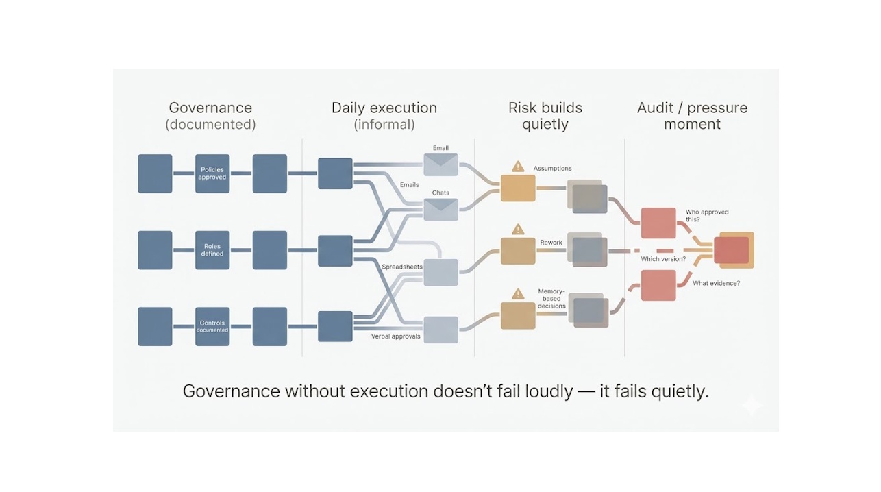 When governance remains in documents while execution relies on email threads or spreadsheets, operations run on assumptions rather than verifiable facts.
