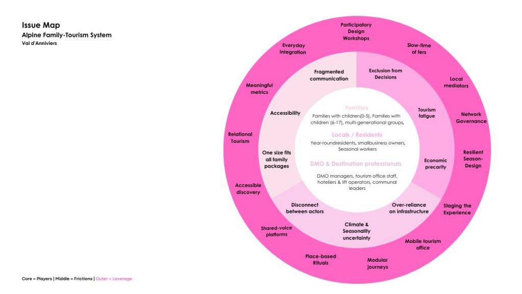 For her master thesis, she collaborates with Val d’Anniviers, where she spent a month on-site to understand the challenges families face when visiting. Through stakeholder meetings, interviews, and observations, she discovered key gaps in the visitor experience – from difficult access roads and unclear signage to a lack of activities designed for both parents and children.