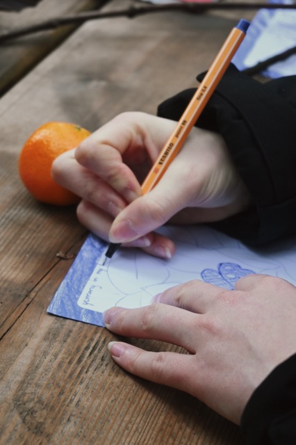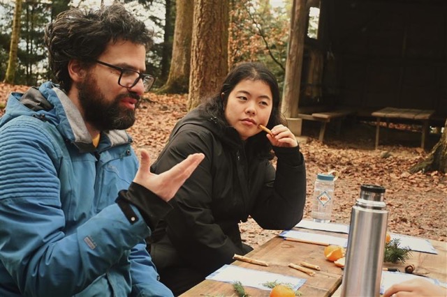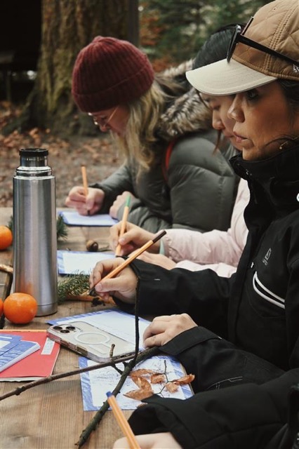 This one was called “Walking as Pausing.” The main tasks, especially at the end of their busy semester, were to break the sitting loop and clear the head. I tried to create a space where they could get a bit lost in time, like kids again — touching things, smelling things, listening, paying attention. Someone brought sweet-smelling tree resin, others found sticks to chew, one person recorded the sound of fast walking through the leaves, and another drew the whole collection of findings on paper. Very simple things, but they made the group really open and relaxed.